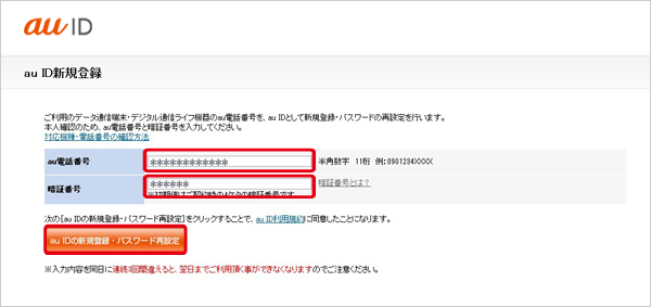 接続しているデータ通信端末のau/UQ mobile電話番号と、暗証番号を入力し、「au IDの新規登録・パスワード再設定」ボタンをクリックしてください。